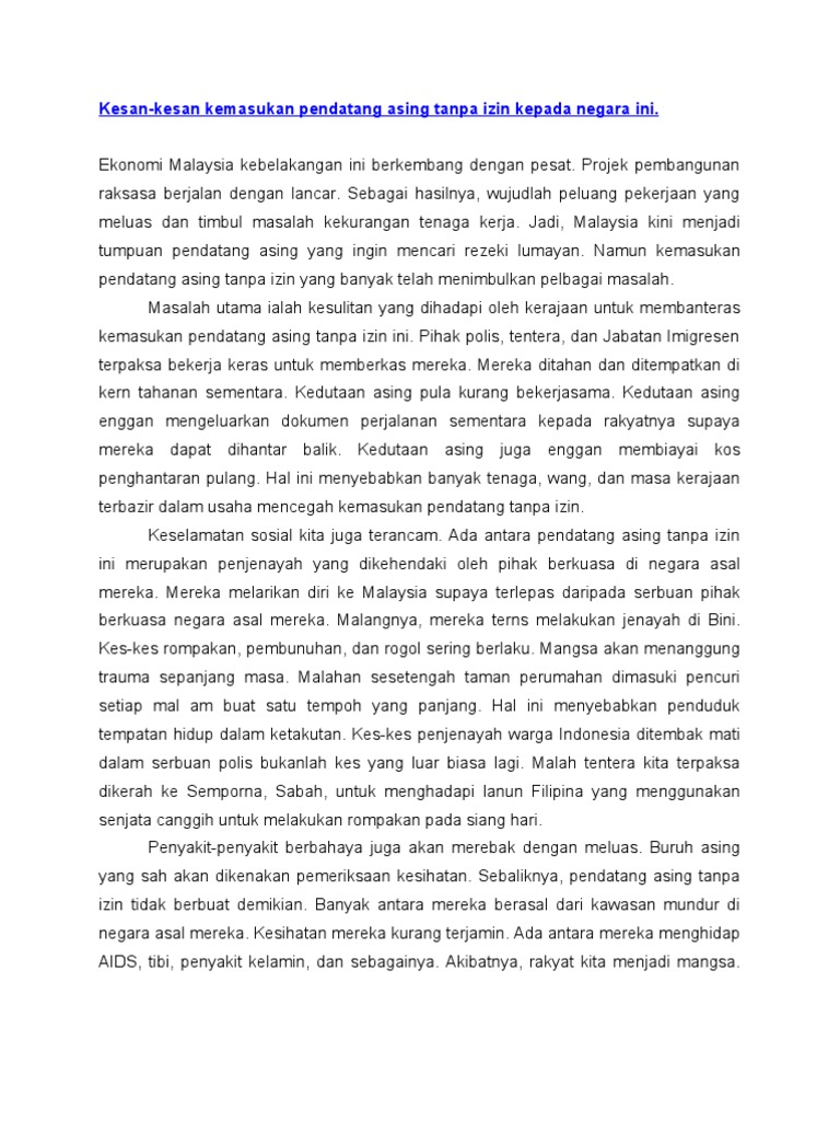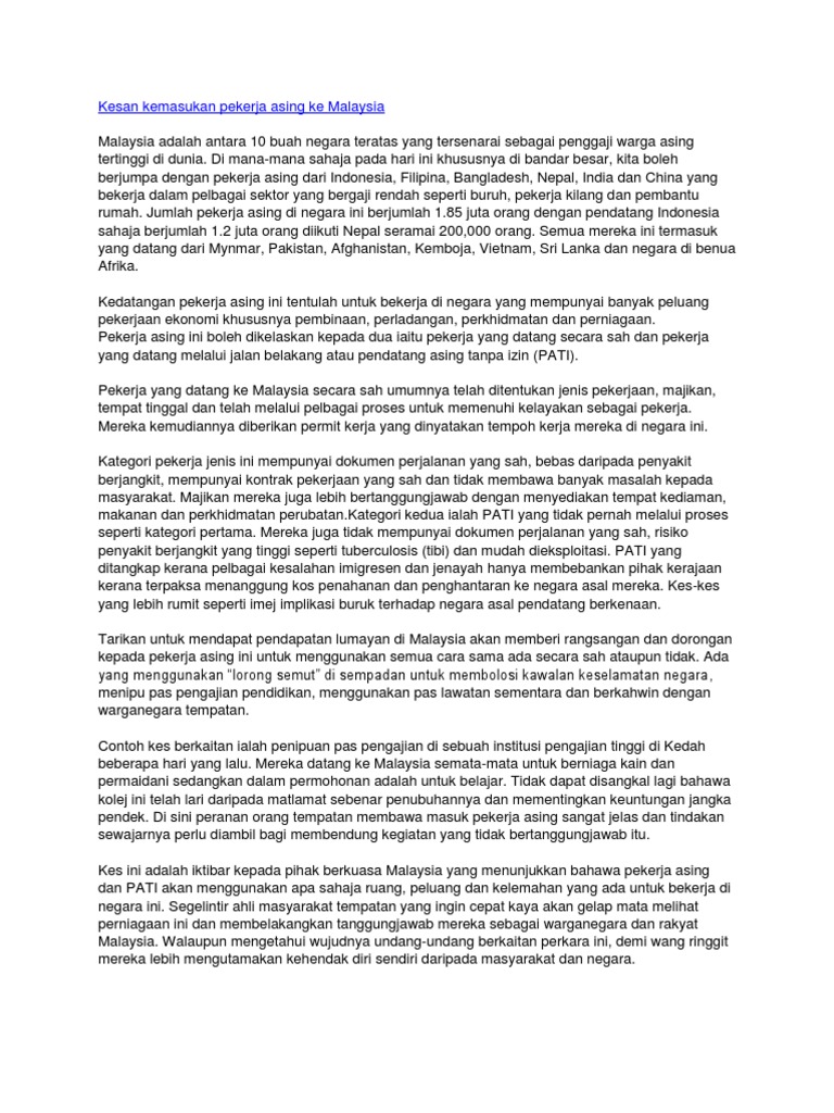 Contoh Karangan Bahagian B Bahasa Itu Indah Bahasa Jiwa Bangsa from 2.bp.blogspot.com Documents similar to kesan kemasukan pekerja asing ke malaysia. Contextual translation of kemasukan pekerja asing into english. .bagi membenarkan semula kemasukan pekerja asing mengisi keperluan kritikal terhadap pekerja ladang kelapa sawit. Sebaliknya, pendatang asing tanpa izin tidak berbuat demikian. Selain itu, kemasukan pendatang asing menyebabkan peluang pekerjaan kepada masyarakat tempatan tersekat. Upah dan peluang pekerjaan bagi pekerja tempatan. Keselamatan negara (mkn) dan kementerian sumber manusia berhubung permohonan kelonggaran kemasukan semula pekerja asing ke dalam sektor perladangan kelapa. Isu kemasukan 1.5 juta pekerja asing warga bangladesh, apakah kepentingannya terhadap malaysia dari sudut ekonomi dan.