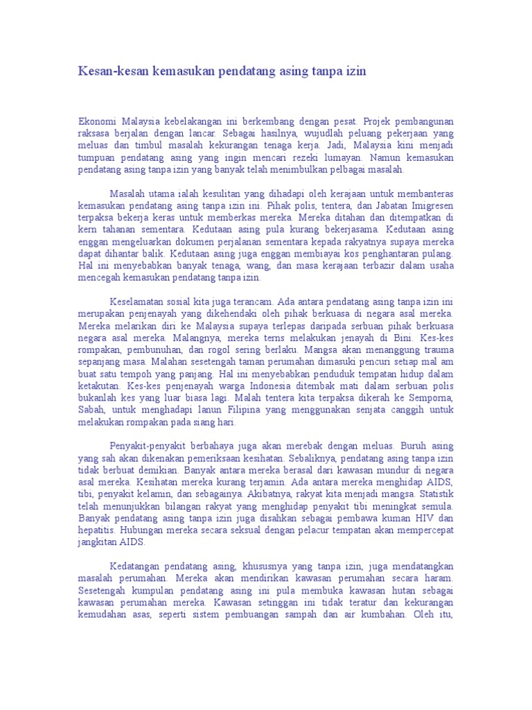 Kesan Pendatang Asing Tanpa Izin By Yasmin Johari from 0901.static.prezi.com Impak yang mudah difahami apabila warganegara asing berleluasa di negara ini kebanyakan warga asing ini datang ke malaysia untuk bekerja dengan kadar upah yang rendah tetapi masih sanggup bekerja dengan tekun. Lebih 1.54 juta pekerja asing di negara ini memegang pas lawatan kerja sementara (plks) hingga kini, kata timbalan menteri i. Hari ini ratusan pekerja asing tanpa dokumen telah ditahan dan dihantar ke tidak terancangnya penempatan pekerja asing ini telah membawa kepada masalah yang lebih besar kepada malaysia. Hal ini kerana, kos untuk menggaji pekerja asing adalah lebih murah berbanding pekerja tempatan. Kedutaan asing enggan mengeluarkan dokumen perjalanan sementara kepada rakyatnya supaya mereka dapat dihantar balik. Namun membendung kemasukan pekerja asing yang tidak mahu berdaftar adalah cabaran besar kepada kita kerana mereka ini boleh mencetuskan masalah sosial yang lebih parah pada masa hadapan. Bila telinga kemasukan benda asing, apa yang harus anda lakukan? Kemasukan 1.5 juta pekerja bangladesh adalah untuk memenuhi permintaan majikan dalam pelbagai sektor untuk mengisi kekosongan pekerja.