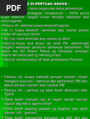 Ada juga orang yang telah dikurniakan gelaran datuk apabila menerima darjah kebesaran panglima jasa negara (pjn). Panglima tertinggi angkatan tentera malaysia dengan kuasanya dilaksanakan oleh majlis angkatan tentera. Membenarkan atau menolak soalan yang dikemukakan oleh ahli dewan b. Ydpa ada kuasa budi bicara untuk menolak permohonan untuk bubar parlimen. Manakala, asas kepada hubungan raja dan eksekutif terkandung dalam perkara 39: Menentukan sesuatu seandainya dia dilucutkan jawatannya oleh ydpa, perkara itu tidak boleh dipertikaikan di mahkamah. Kenapa ydpa nak jumpa tunm dan dsai/dswa? Kerana tuanku hendak berlaku adil dan sahkan dari dua belah pihak siapa yang sebenarnya mendapat sokongan majoriti dari dewan. Sejarah f5 bab 7 : Beliau mempunyai kuasa budi bicara utk melatik perdana menteri. Perpustakaan undang undang ppt video online download. Ketua audit negara & peguam negara. Di antara kuasa ydpa ialah
